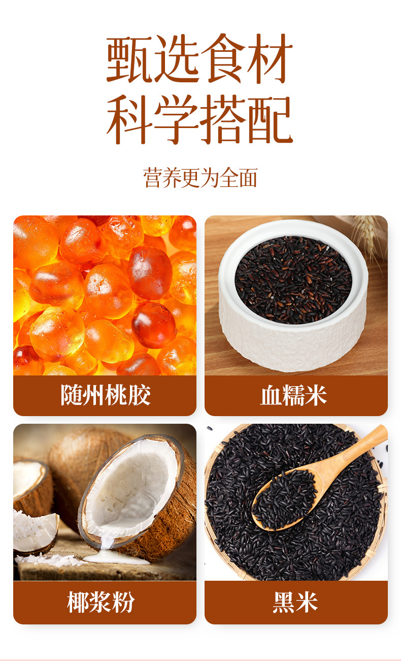 甄选食材,科学搭配,营养更为全面,随州桃胶,血糯米,椰浆粉,黑米