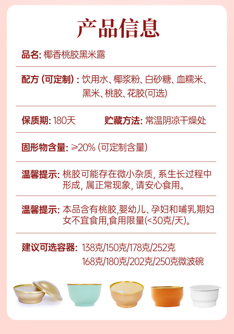 配方(可定制):饮用水、椰浆粉、白砂糖、血糯米、,黑米、桃胶、花胶(可选)