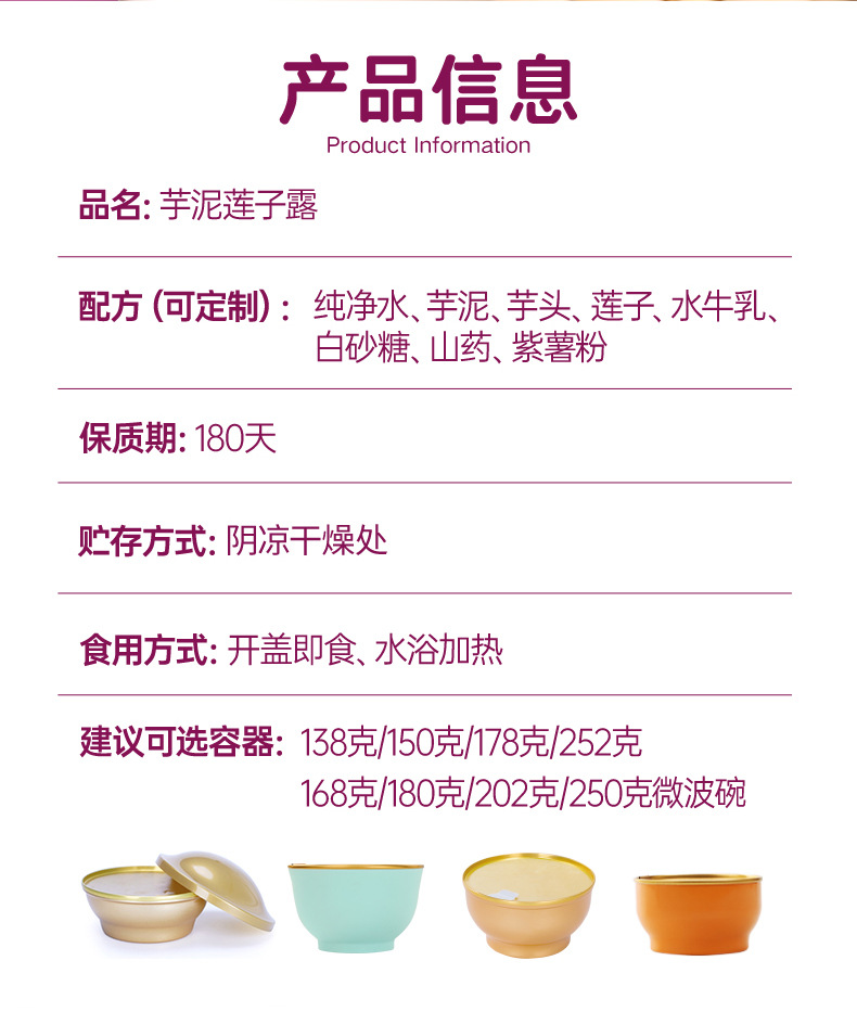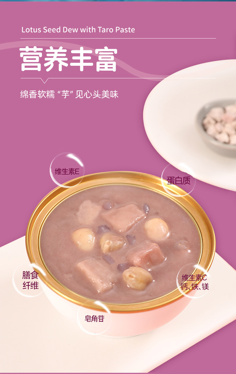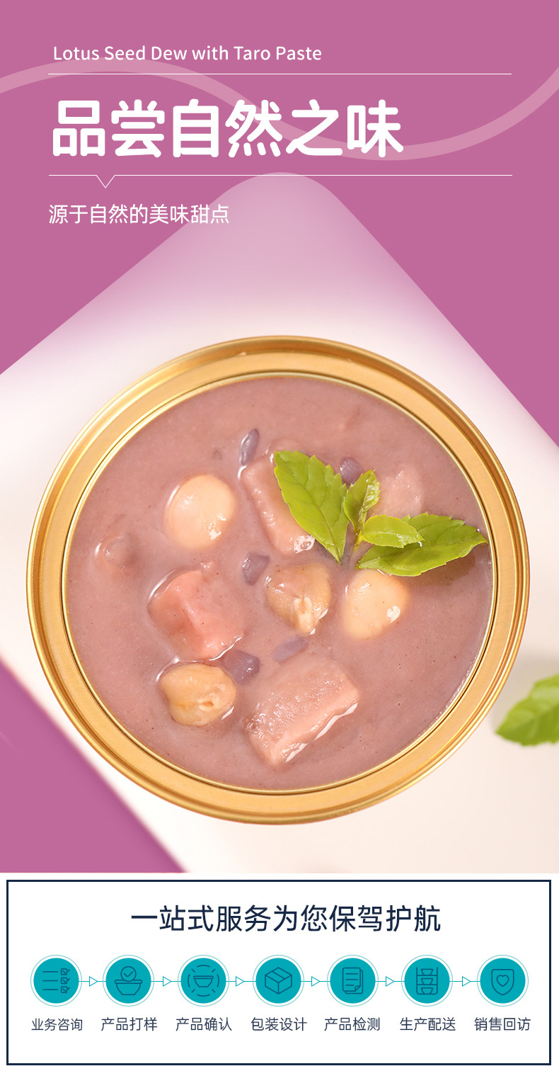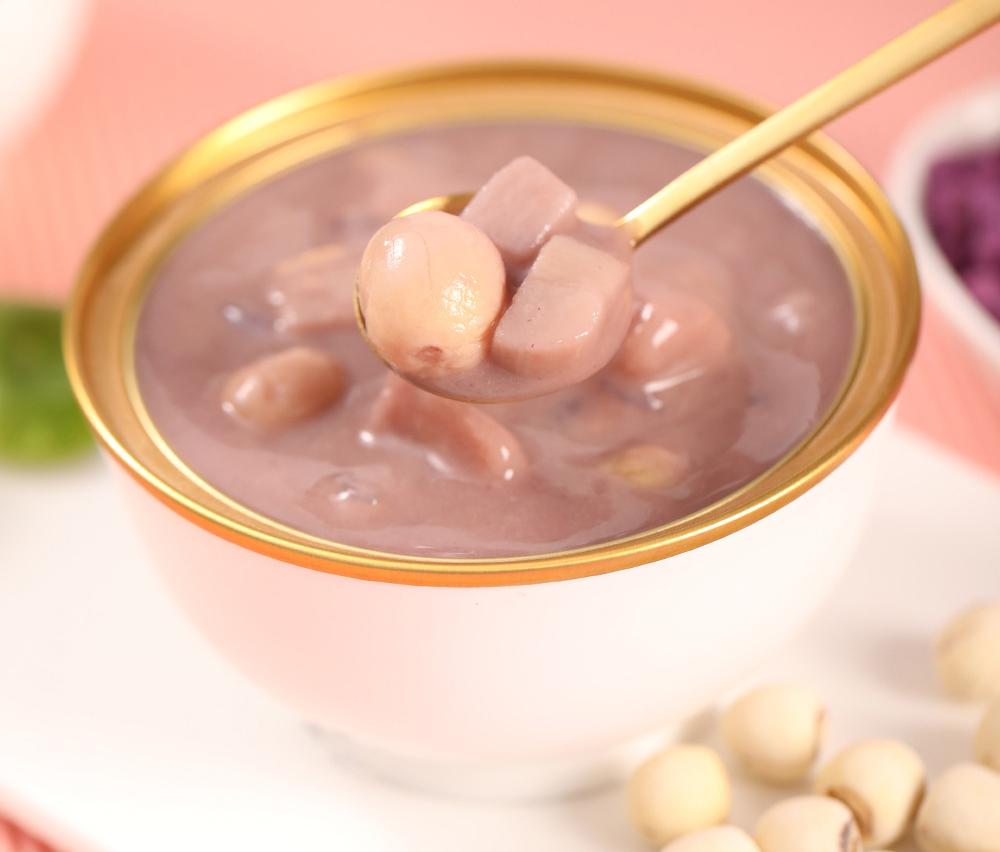 恒源健康(厦门)食品科技有限公司讯:糖水甜品贴牌厂家恒源健康(厦门)食品科技有限公司芋泥莲子露详解详情如下: