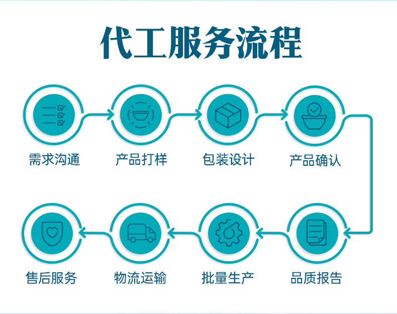 需求沟通,产品打样,包装设计,产品确认,售后服务,物流运输,批量生产,品质报告