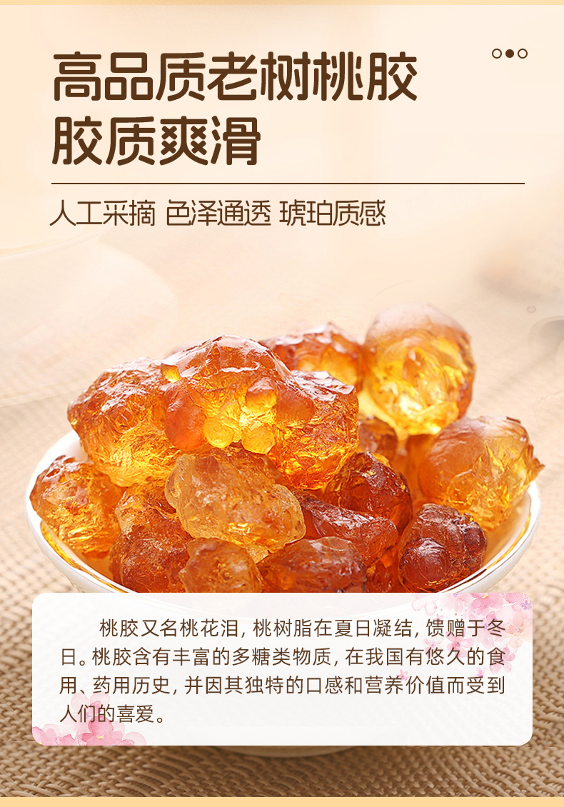 桃胶又名桃花泪,桃树脂在夏日凝结,馈赠于冬日。桃胶含有丰富的多糖类物质,在我国有悠久的食用、药用历史,并因其独特的口感和营养价值而受到人们的喜爱。