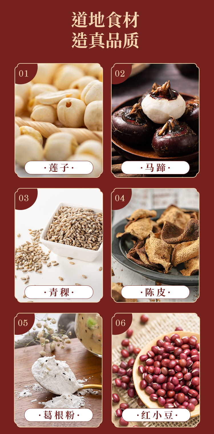 道地食材,造真品质,莲子、马蹄、青稞、陈皮、葛根粉、红小豆。