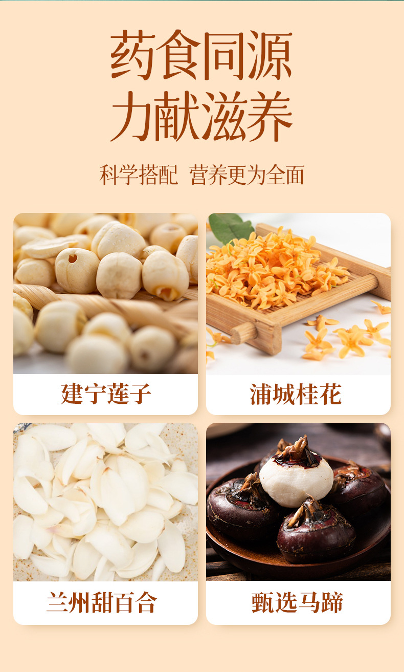 药食同源,力献滋养,科学搭配,营养更为全面,建宁莲子,浦城桂花,兰州甜百合,甄选马蹄