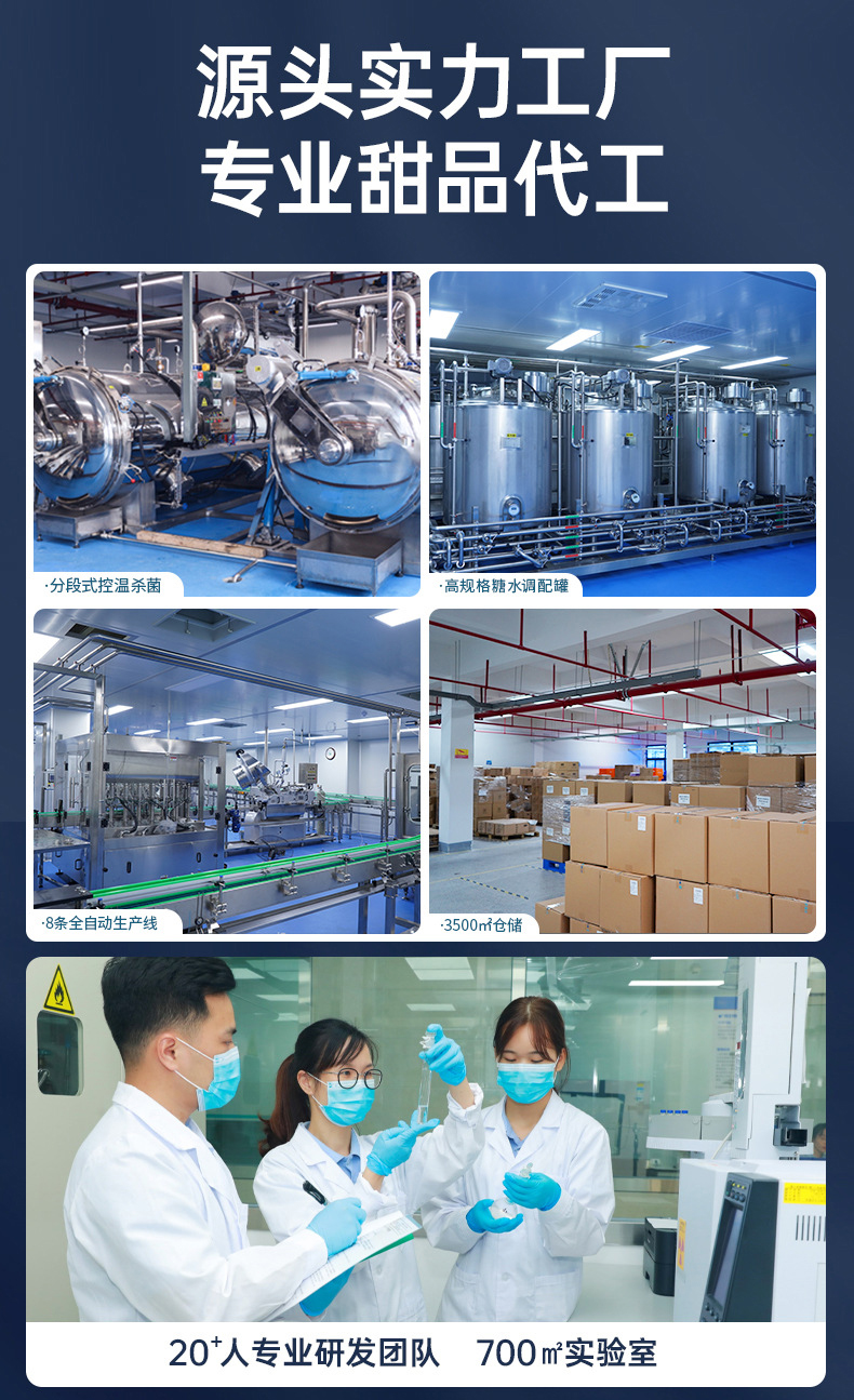 源头实力工厂,专业甜品代工,分段式控温杀菌,高规格糖水调配罐,多条全自动生产线,3500㎡仓储,20多人专业研发团队700㎡实验室