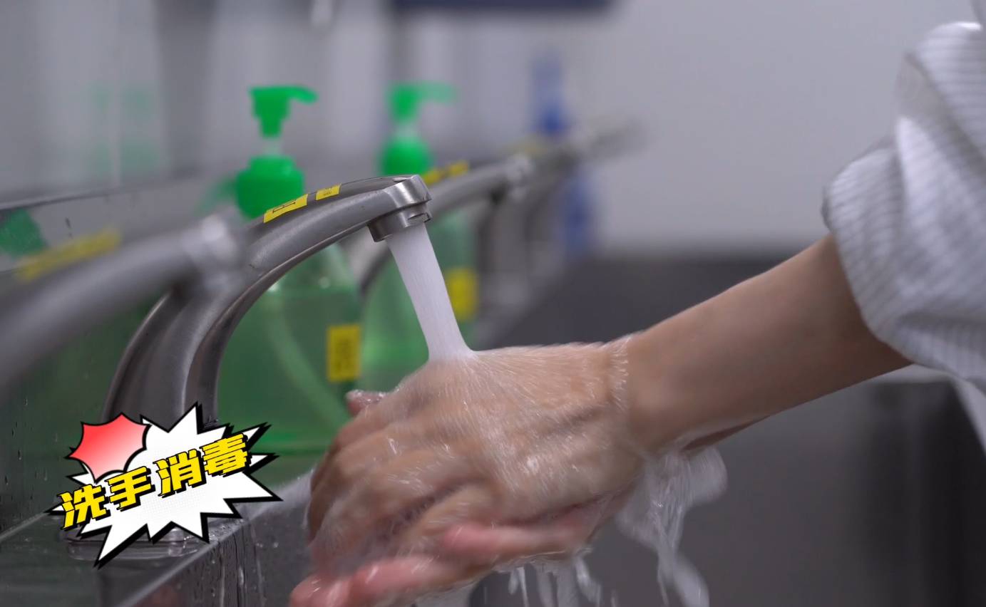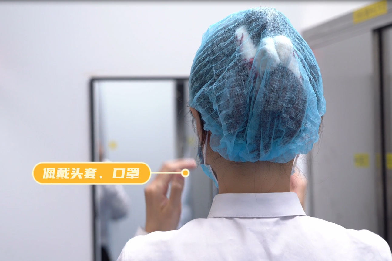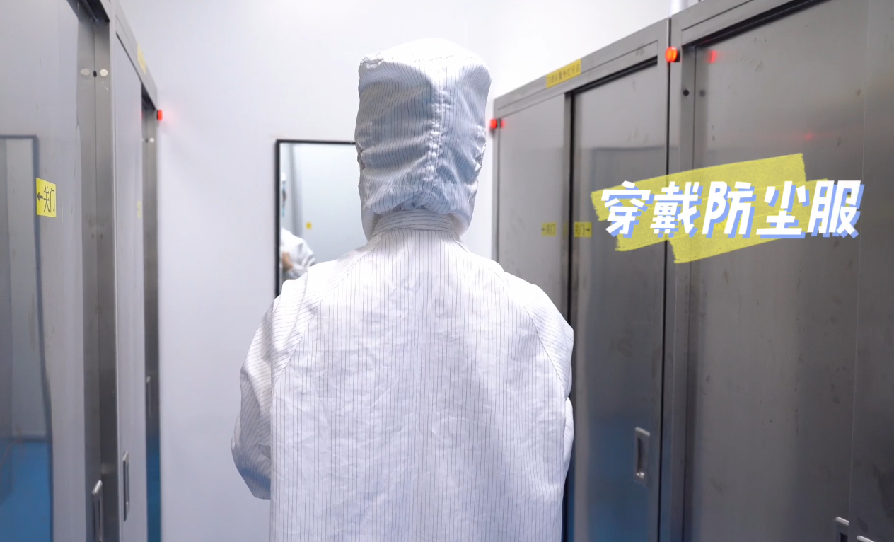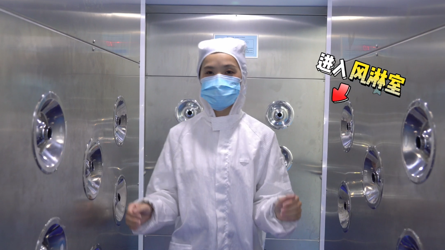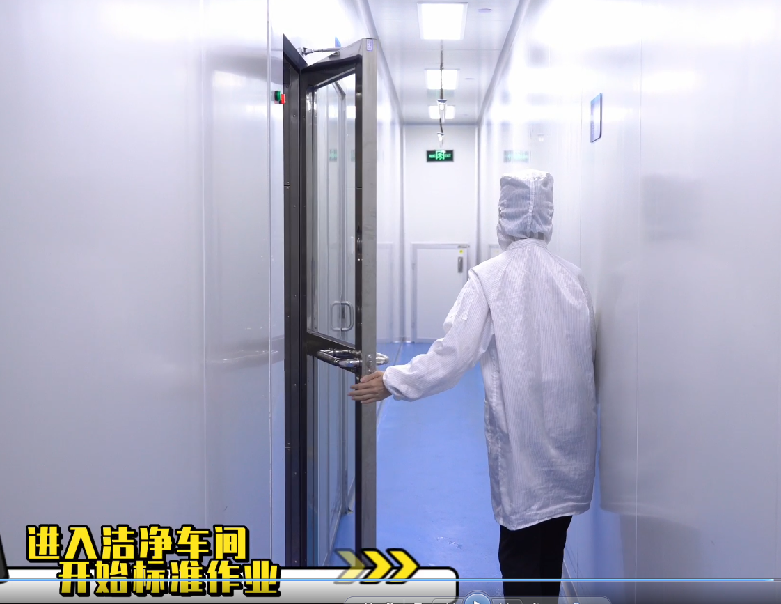 佩戴头套,口罩——穿戴防尘服——洗手消毒——进入风淋室——进入洁净车间,开始标准作业